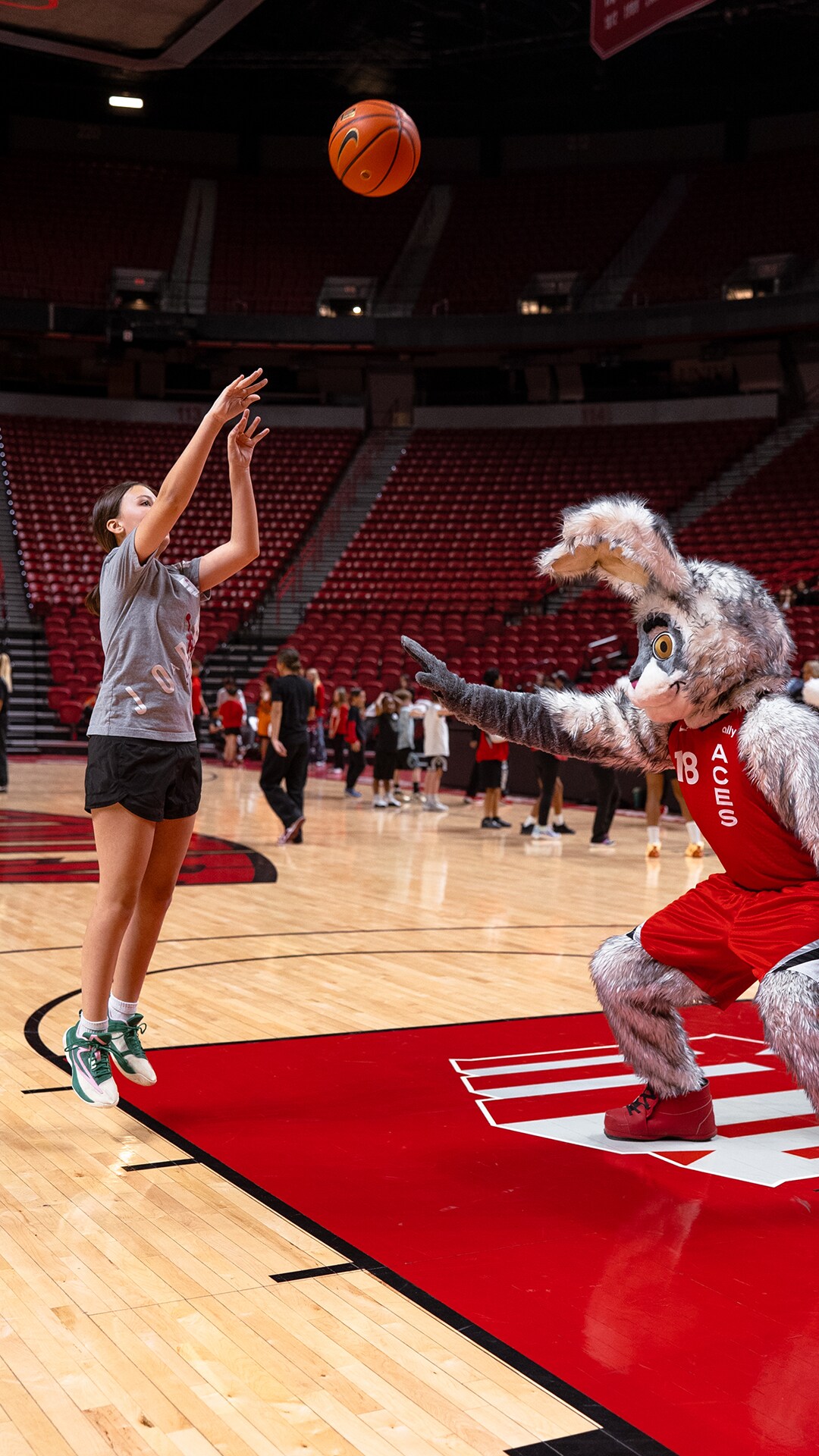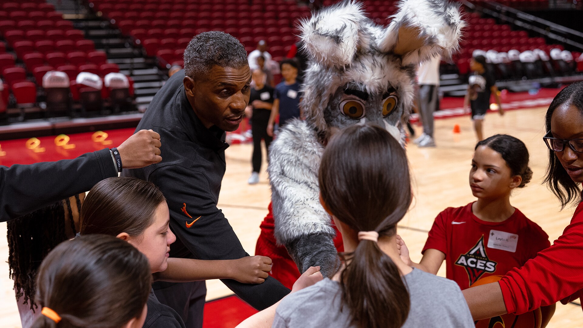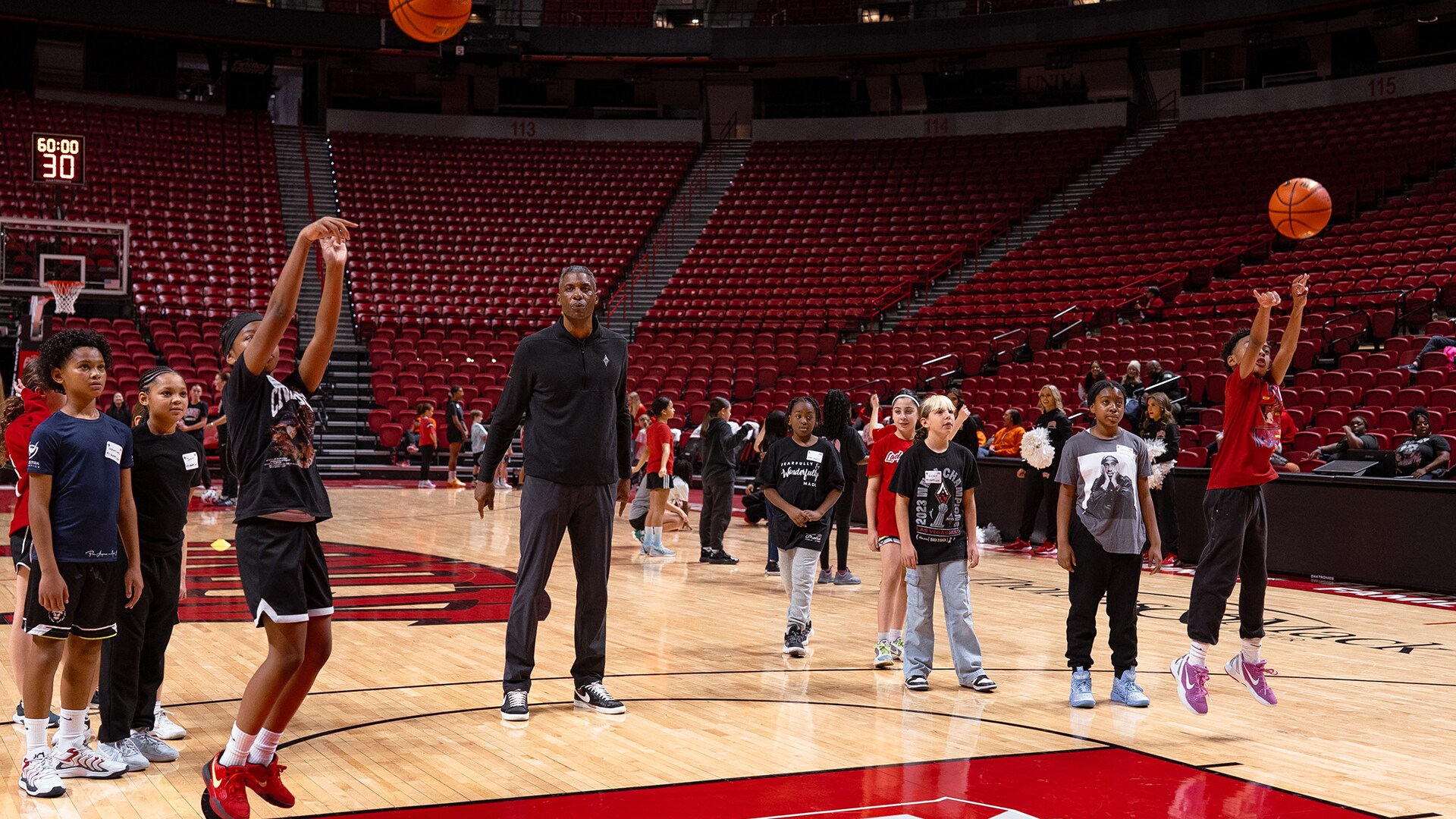 The Las Vegas Aces joined the UNLV Athletic Department for a free all-sports clinic at the Thomas & Mack Center, followed by attending the Lady Rebels game against University of Nevada, Reno in honor of National Girls and Women in Sports Day. Aces assistant coach Larry Lewis, along with members of the team's practice squad, helped lead the clinic. The event encouraged kids to stay active and confident through sports and motivational programming!